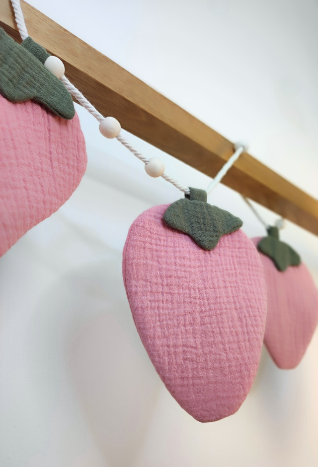 La guirlande Ribambelle de fraises à été imaginée pour célébrer le printemps et les premiers fruits de la saison. Le tissu double gaze de coton lui donne un aspect irrégulier, non lisse, la rendant plus naturelle.