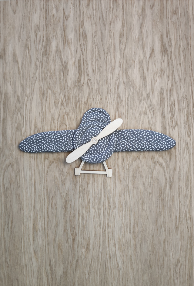 Invitez votre enfant à s'envoler vers des aventures imaginaires avec cet avion réalisé en coton composé de jolis petits motifs. Une attention particulière est apportée aux détails avec son hélice et ses roues en bois qui apportent du relief à cette création.